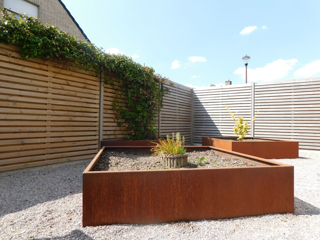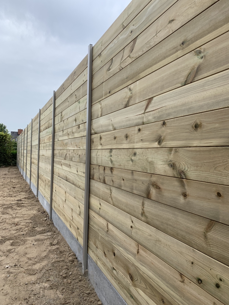 We zijn gespecialiseerd in omheiningen met aluminium palen voorzien van een gleuf waar je makkelijk een houten scherm kan in plaatsen die steunt op een betonplaat.
